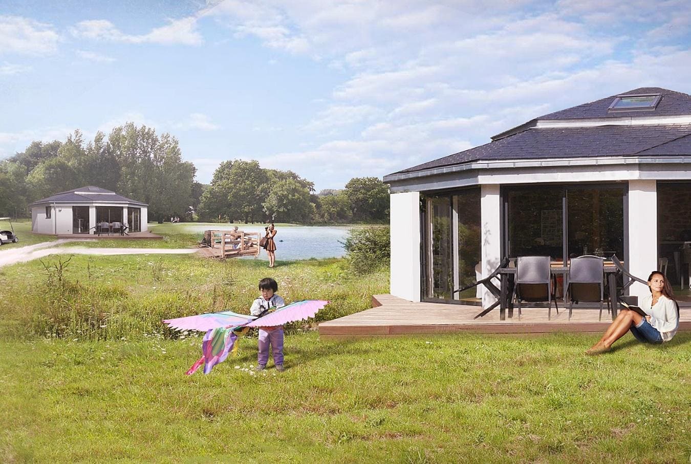 - Une ventilation interne naturelle qui par le jeu d’ouvertures basses dans les modules et hautes dans le foyer, permet une régulation de la température été comme hiver. Ce système de ventilation sera complété par une VMC simple flux hygroréglable B en base ou double flux en variante.